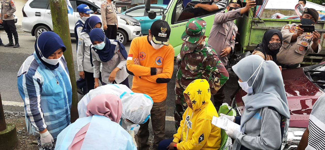 Bupati Sachrul Mamonto melihat kesiapan petugas dari dinas kesehatan dalam melakukan swab antigen kepada salah satu pemudik yang tidak memakai masker ketika melintasi pos pengamanan lebaran.