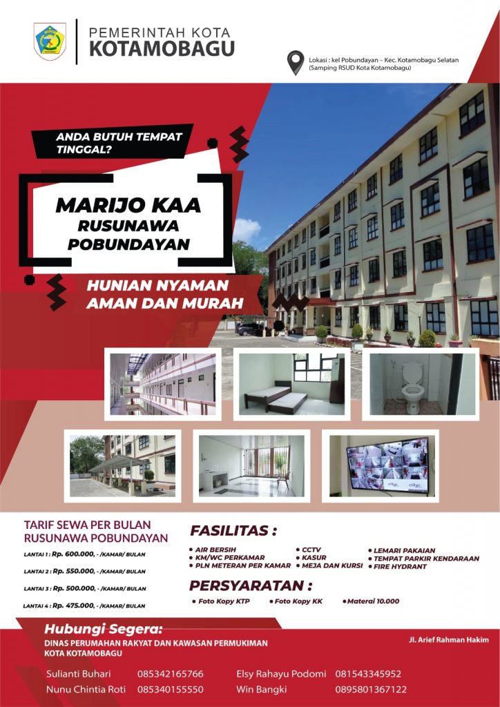 “Bagi masyarakat yang ingin menyewa Rusunawa, bisa langsung datang ke kantor Dinas PRKP Kota Kotamobagu di Jalan Arif Rahman Hakim Kelurahan Kotamobagu, dengan hanya membawa foto copy Kartu Tanda Penduduk dan Kartu Keluarga,” ujarnya.