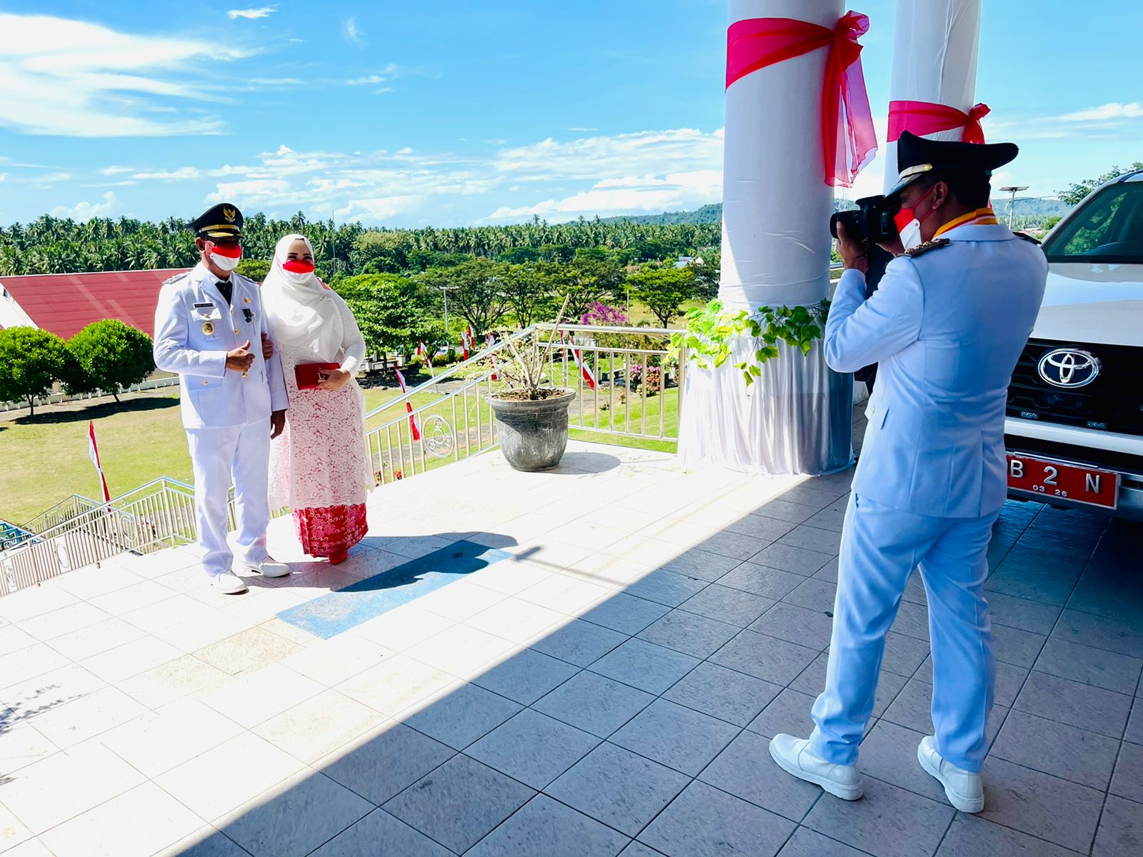 Saat itu Bupati yang menggunakan seragam lengkap PDU terlihat memegang kamera sambil mengatur posisi berdiri Wabup Oskar dan istrinya.