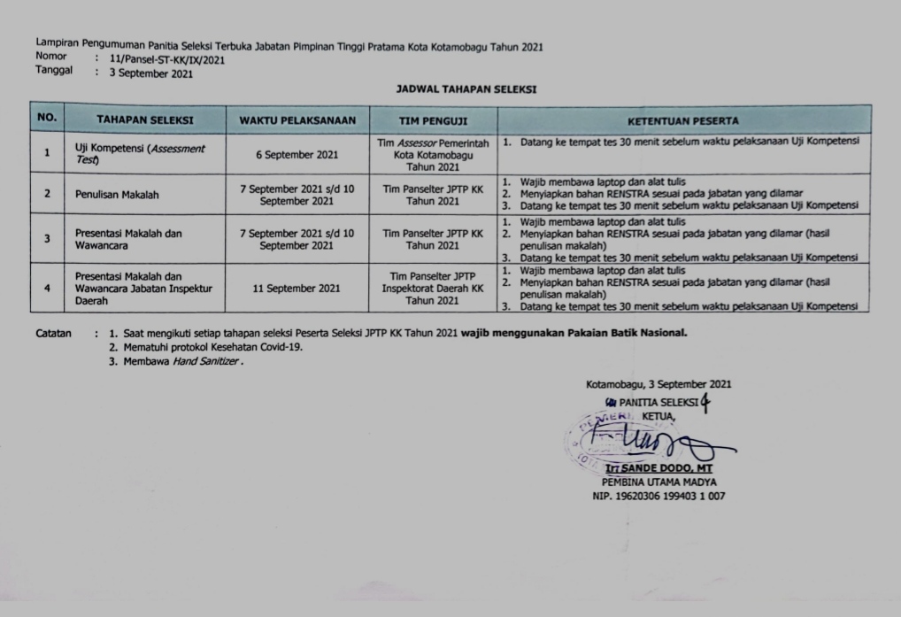 KOTAMOBAGU, KONTRAS MEDIA – Pemerintah Kotamobagu mengeluarkan hasil penilaian administrasi seleksi Jabatan Pimpinan Tinggi Pratama (JPT Pratama) Kotamobagu, Jumat, 3 September 2021.