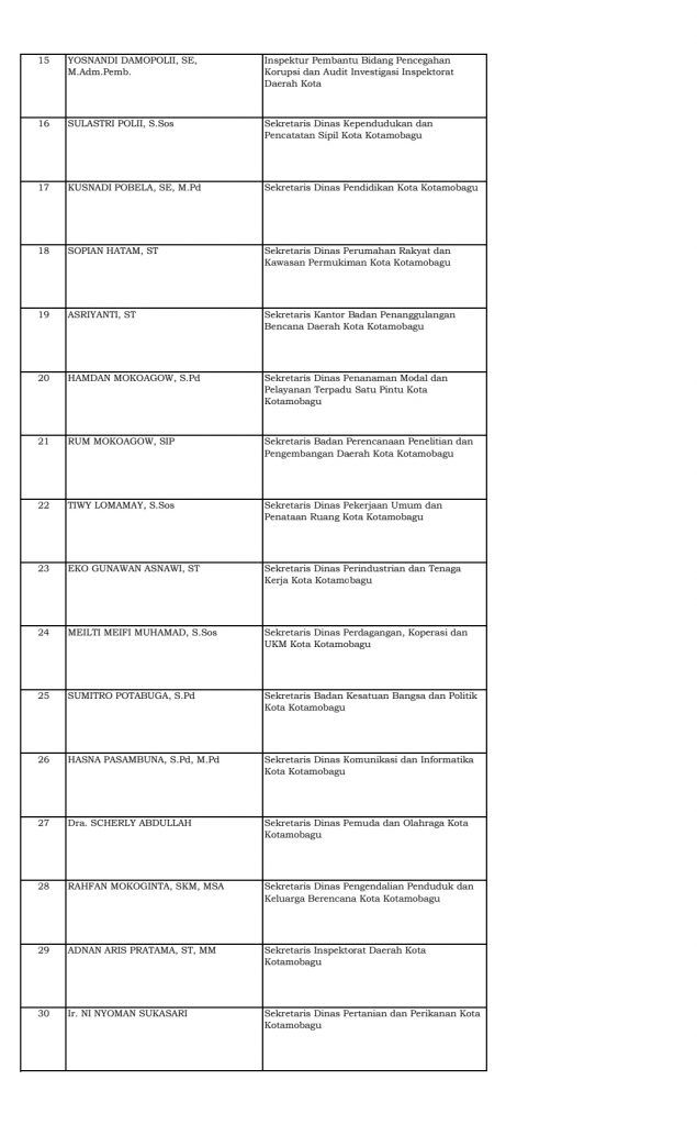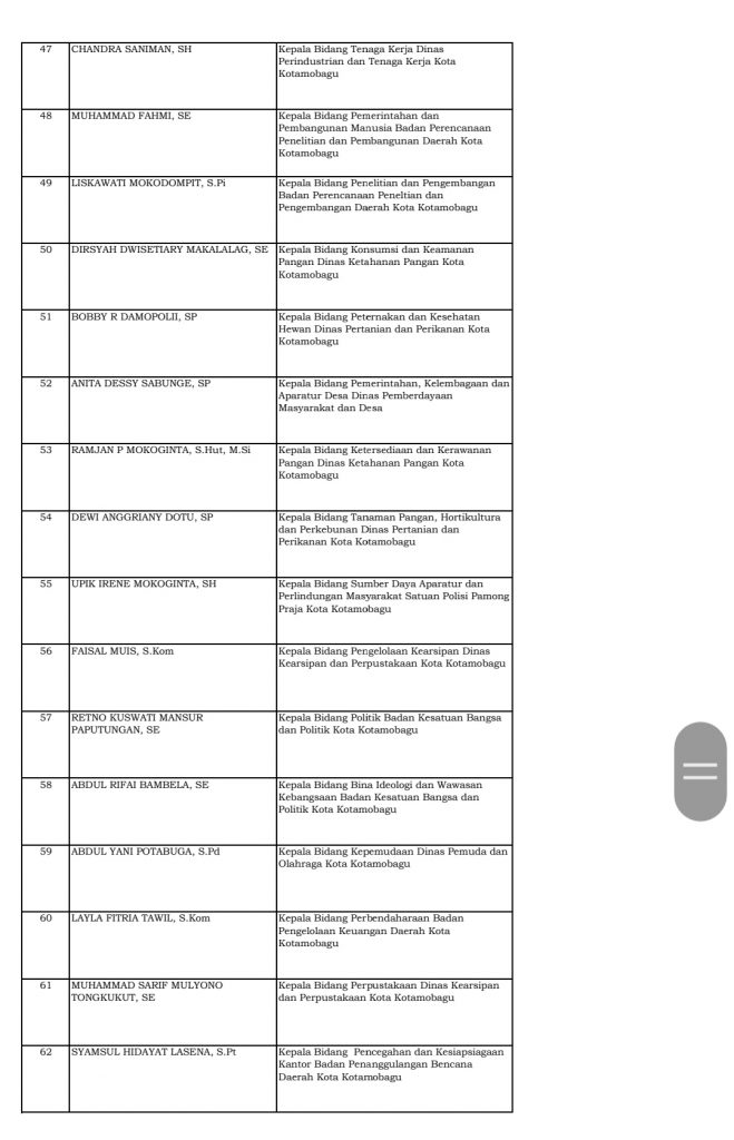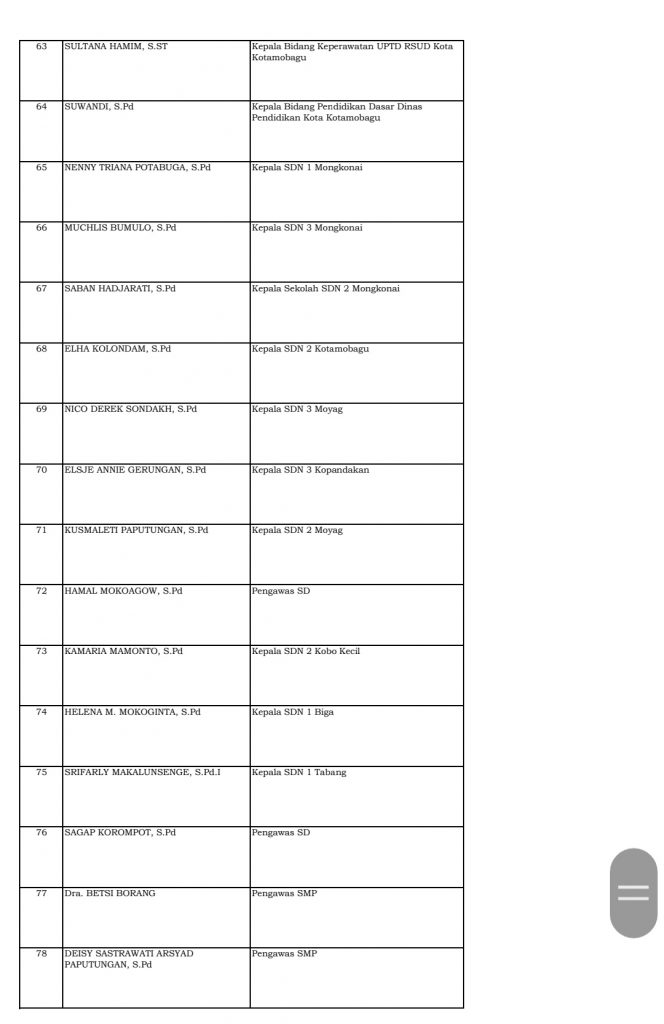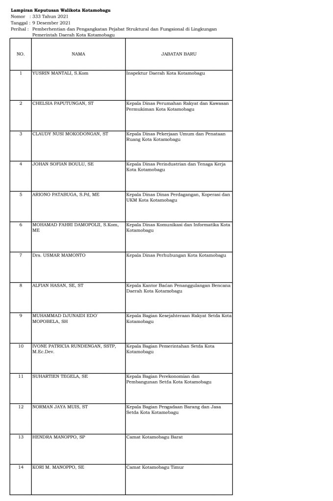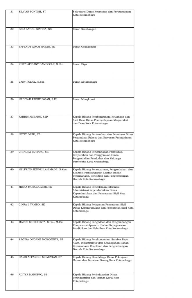 Home Boltim Daftar Lengkap Nama Pejabat Dilantik Wali Kota, Part I BoltimKotamobagu Daftar Lengkap Nama Pejabat Dilantik Wali Kota, Part I By Redaksi Bohusami - December 10, 2021 1 0 Facebook Twitter WhatsApp Telegram KOTAMOBAGU, KONTRAS MEDIA – Wali Kota Kotamobagu, Tatong Bara resmi melantik sejumlah pejabat struktural san fungsional di lingkungan Pemkot Kotamobagu, Jumat, 10 Desember 2021. Berikut daftarnya: