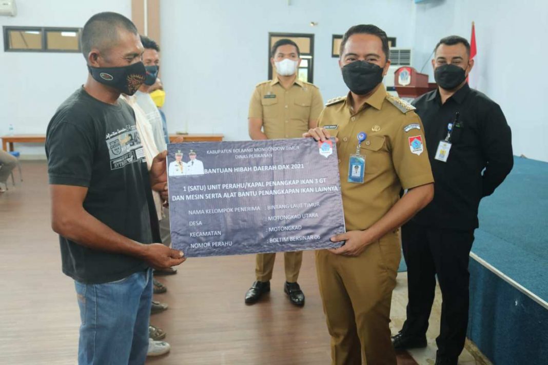 BOLTIM, KONTRAS MEDIA – Bupati Kabupaten Bolaang Mongondow Timur (Boltim) Sam Sachrul Mamonto, menyerahkan bantuan hibah daerah kepada kelompok nelayan yang ada di Boltim.